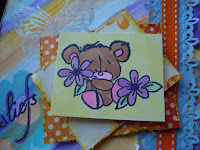 Ik heb lint gebruikt om de randen. En stof in het midden. Er een label aangehangen lekker groot als middelpunt van de vlag. Daar weer op een papiertje beinkt en vervolgens in de fik gestoken. Voor een wat oude grappige look. Want op dat papiertje staat een lief gedichtje voor het liefdespaar!